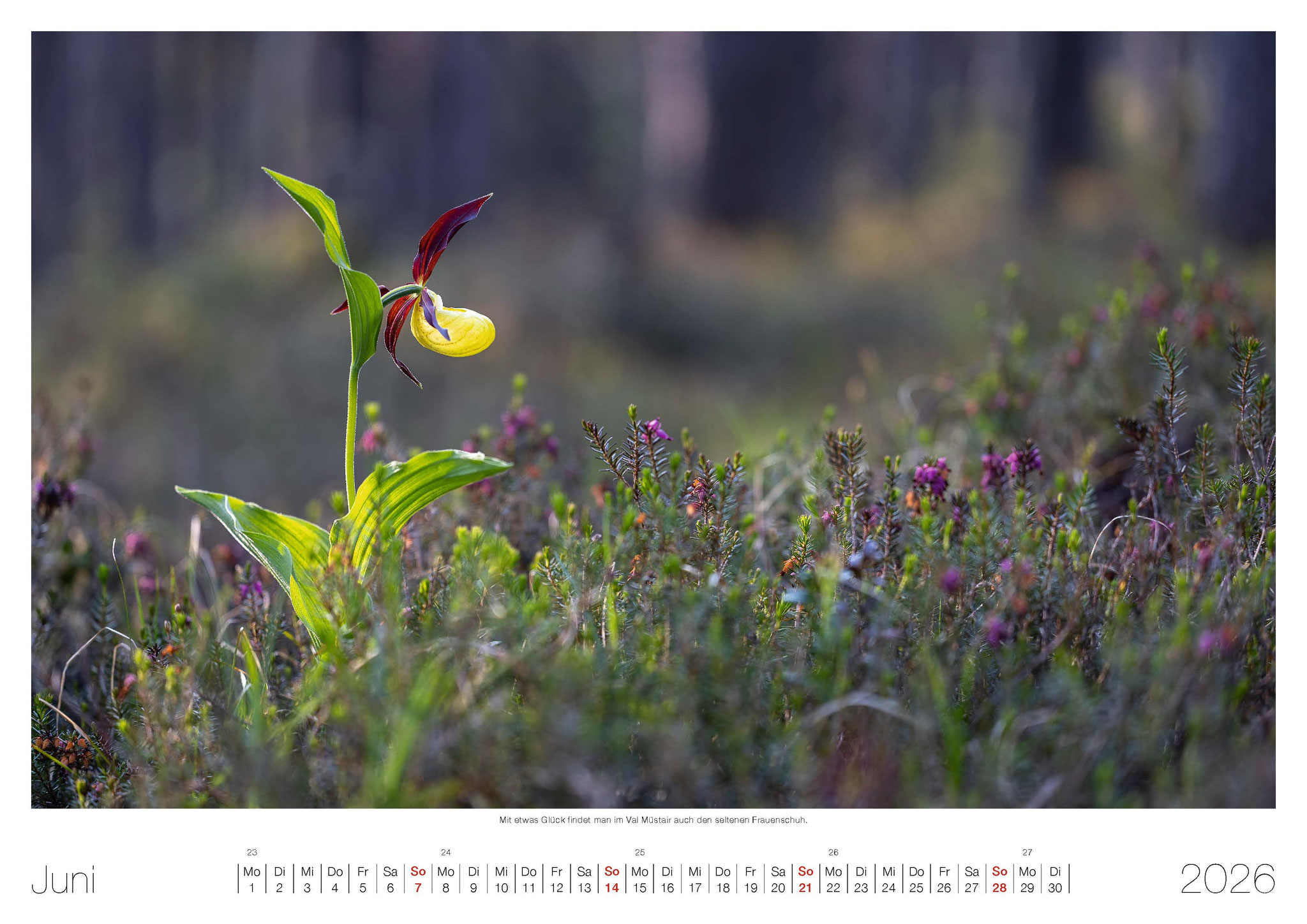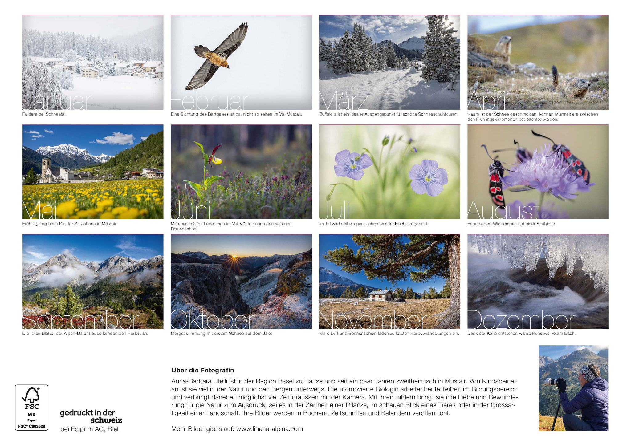 Der neue Kalender Val Müstair 2026 zeigt die Vielfalt der Natur in diesem schönen Tal im östlichsten Teil der Schweiz. Der Kalender im Format A3 ist direkt bei mir und im Klosterladen in Müstair erhältlich. Er kostet CHF 34.00 (plus allfällige Versandkosten).